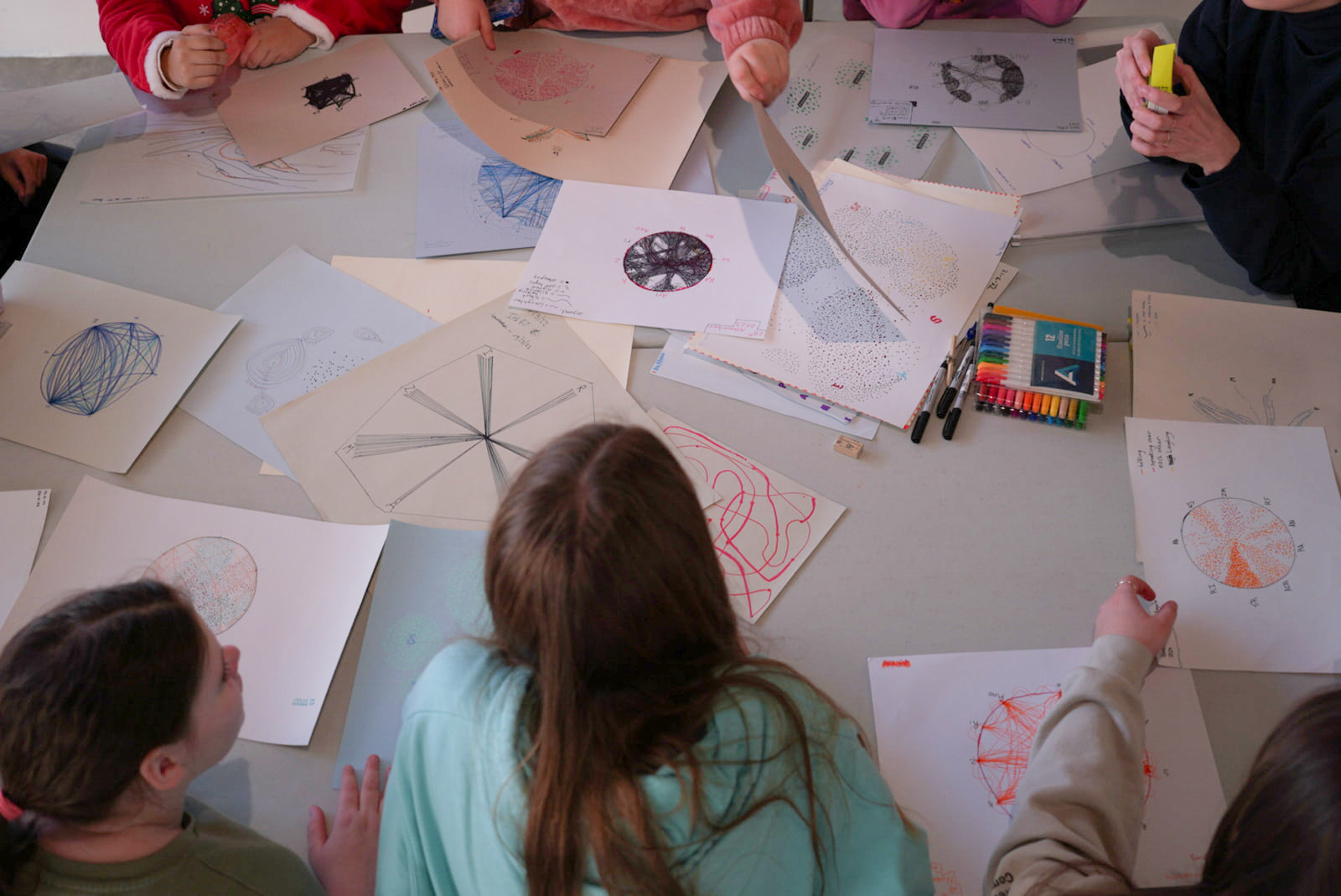After each conversation, the students and the artist have drawing workshops to draw the structures of their exchanges. These drawings collectively help the group understand the power dynamics, relationships, support networks, etc., that arise through the weekly conversations. As the project moves along, the students will be invited to come and hang their own drawings in the exhibition space, wherever they wish, reclaiming the meaning of the installation and contributing to it. Week after week, the exhibition will evolve with the students asserting the importance of their involvement.