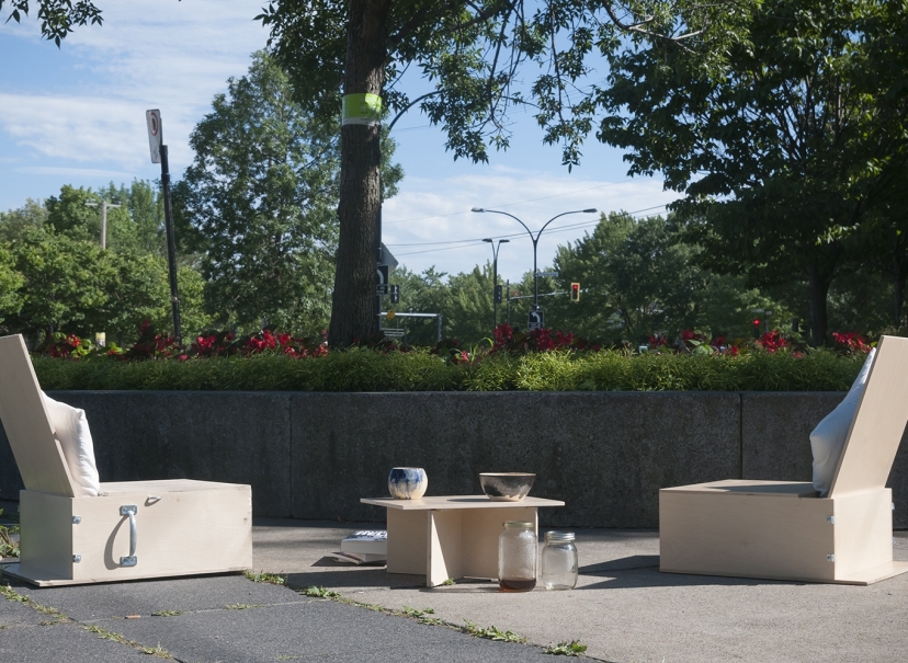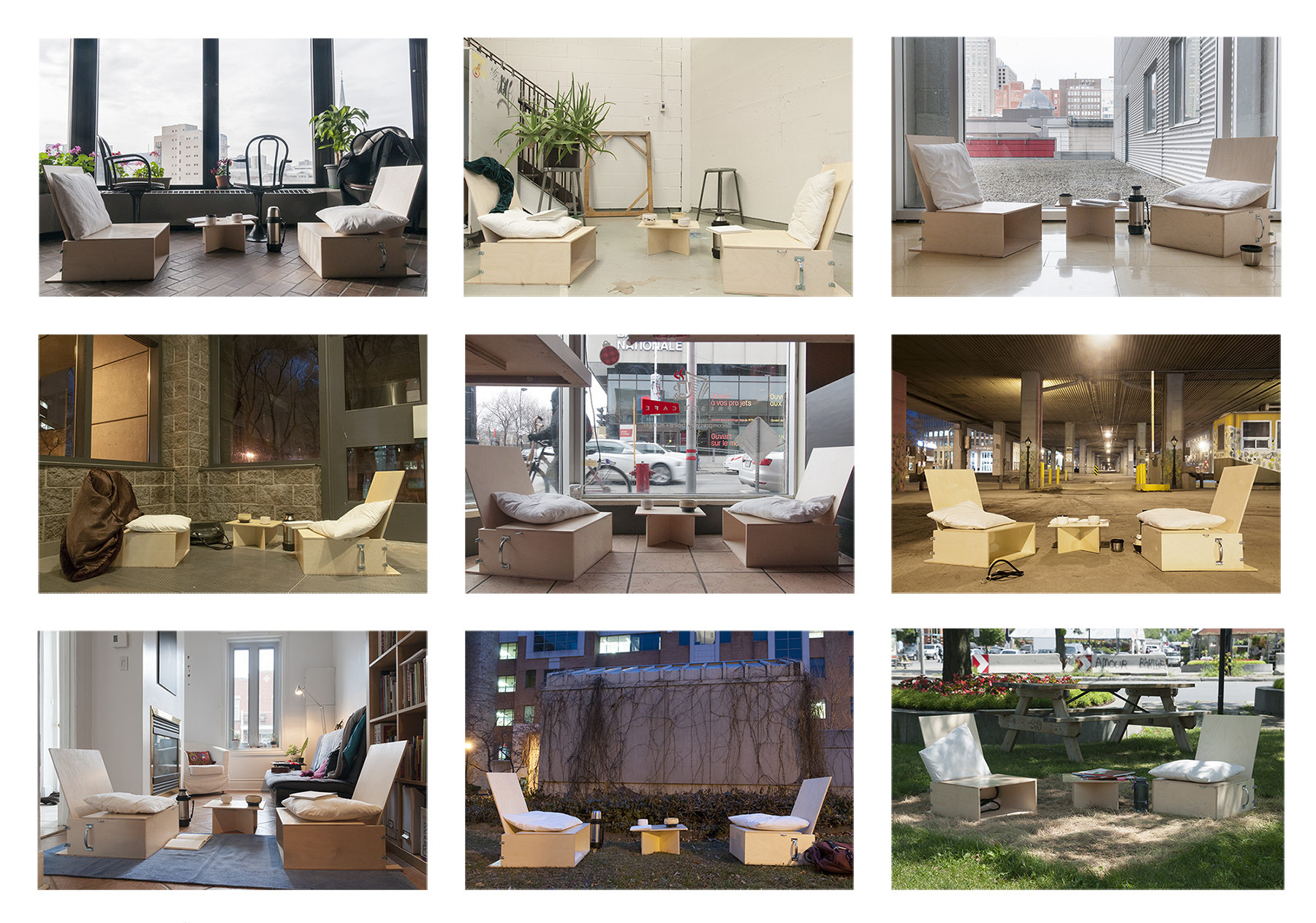 Dealing with notions of spectatorship, responsability and autonomy, the conversations took place in public spaces transformed by the modular furniture.