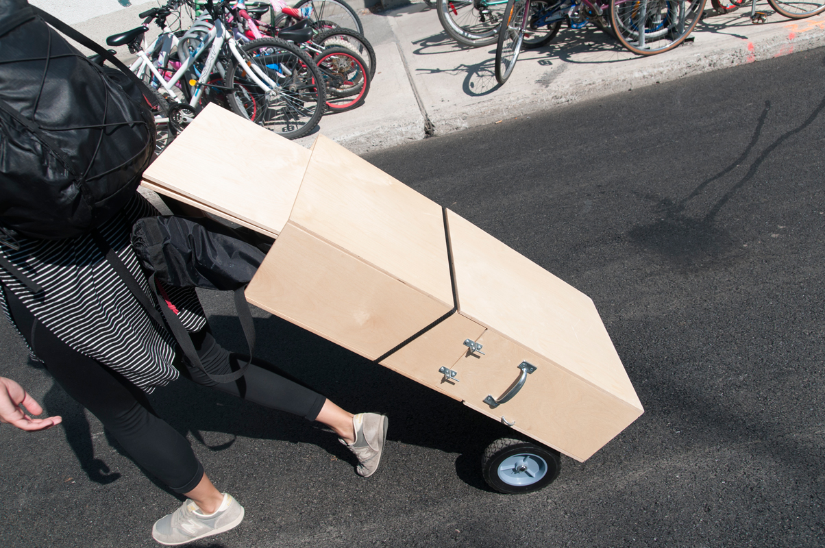 Walking the streets pulling on my hand truck, I installed my portable furniture wherever it felt right. Passers-by, retired teachers, students, workers, stay-at-home moms, people with disabilities and homeless people stopped and sat with me to have a conversation. I handed them the little sculpture as a way to start the discussion on utopia and ideal societies.