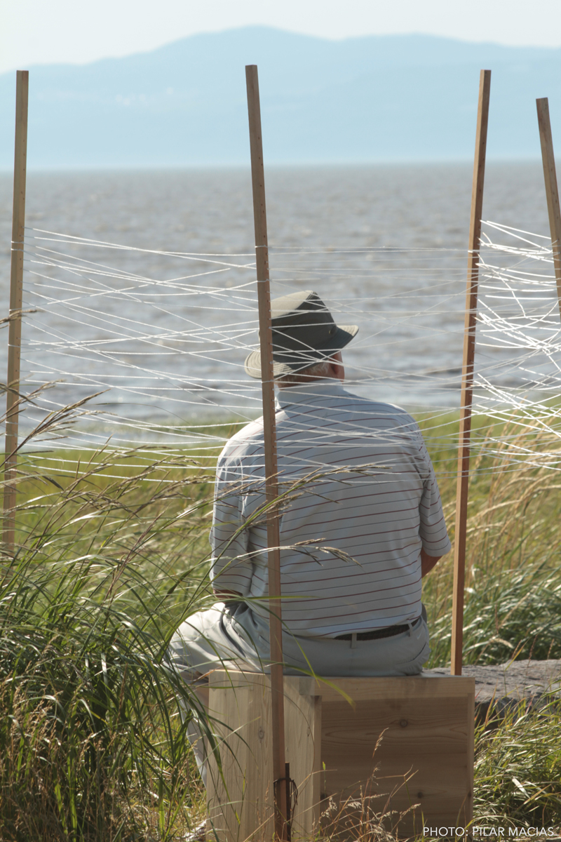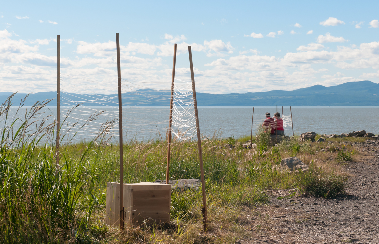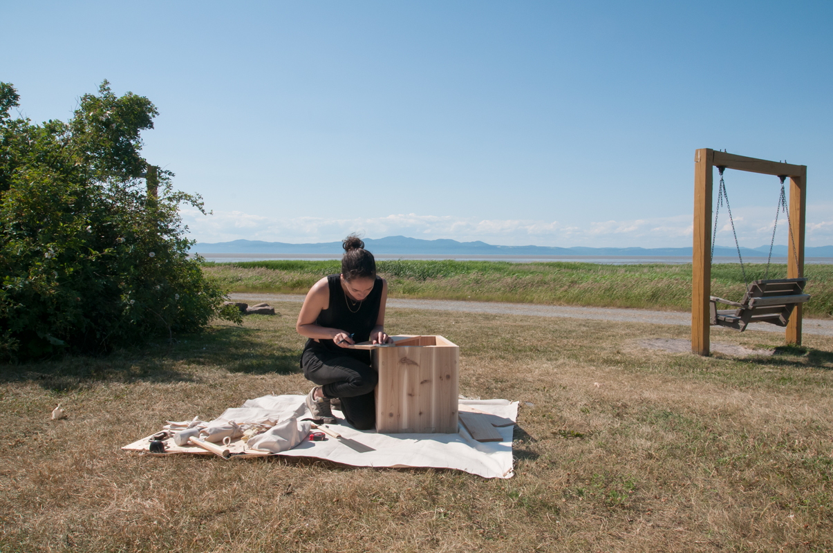 Working to lengthen my perception of time, I used only manual wood working tools during my whole residency. Every day, I walked ten kilometres to the St Lawrence River and back, carrying my tools and portable workbench. I built an immersive installation inviting members of the community and travelers to lengthen their own perception of time through the contemplation of the landscape.