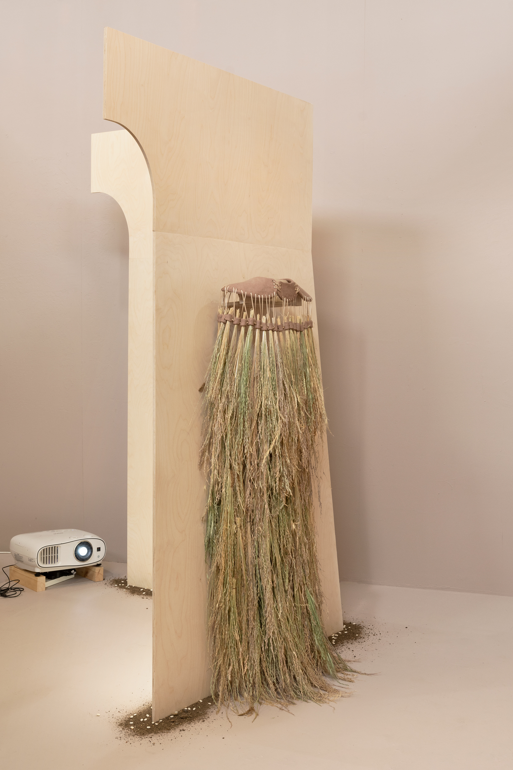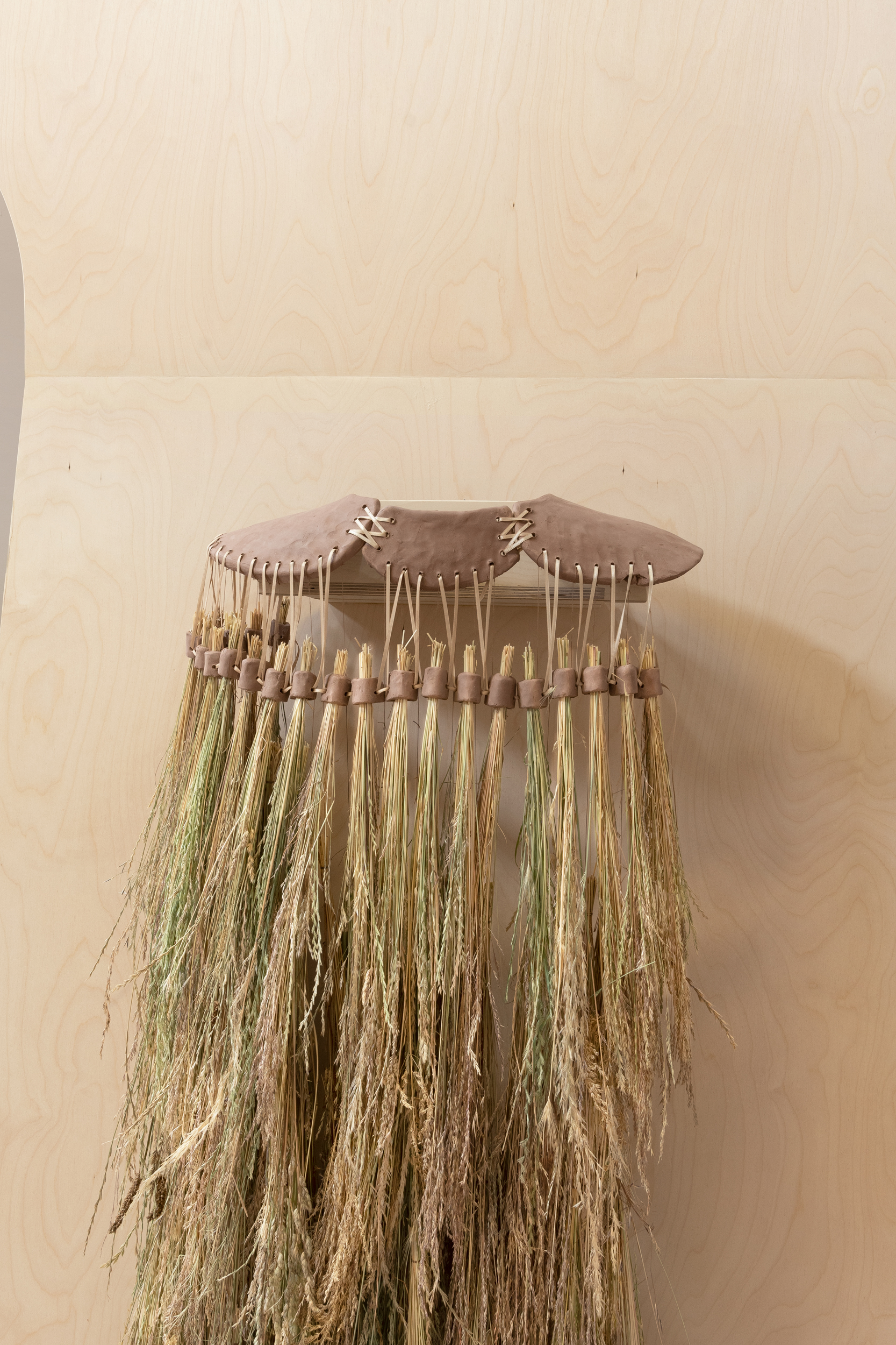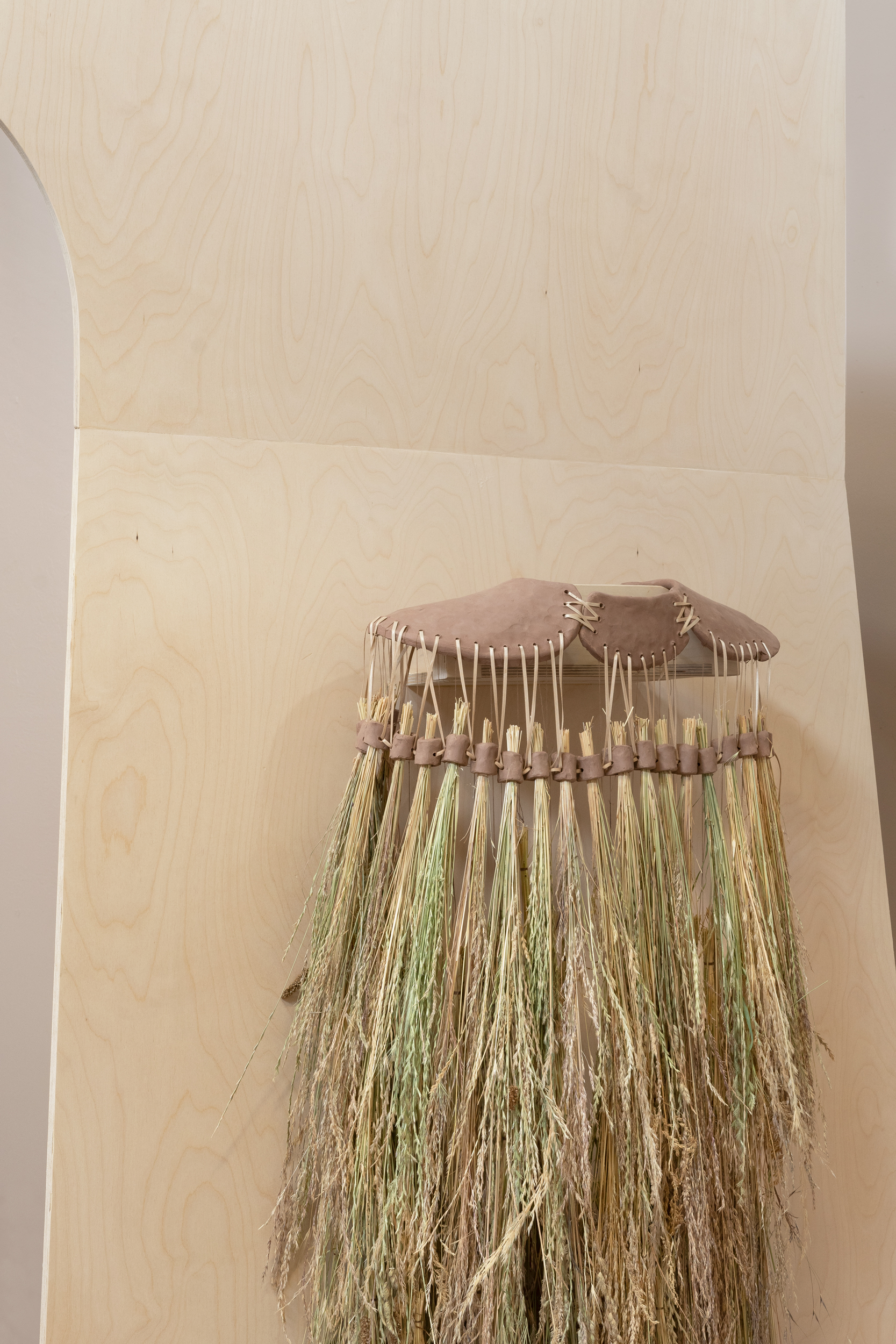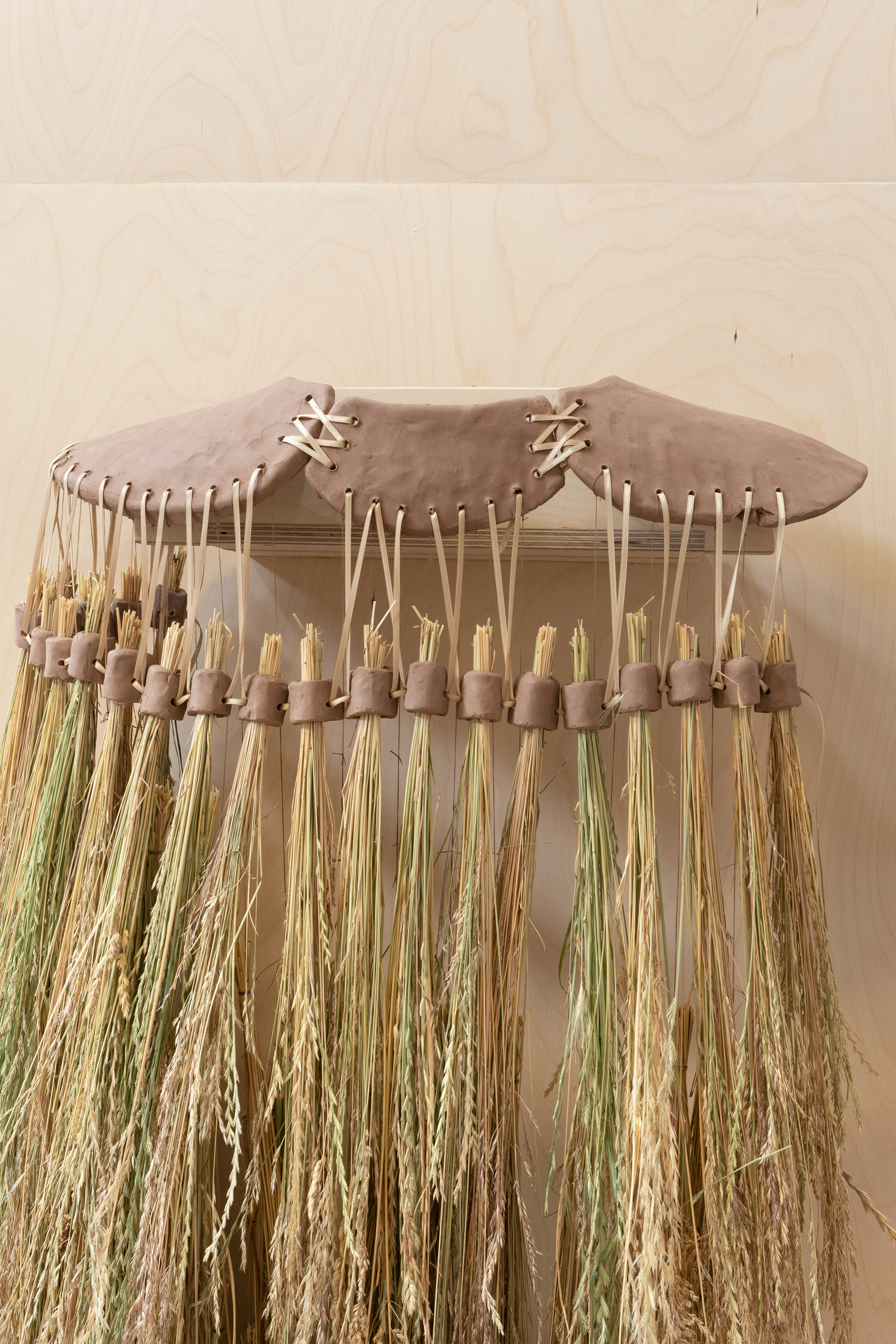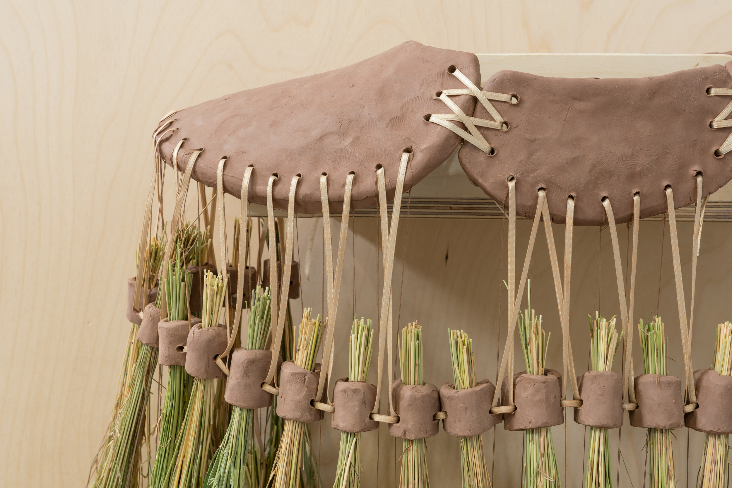 Cape. Argile crue, foin des champs, ruban, fil. 40cm x 25cm x 145cm
