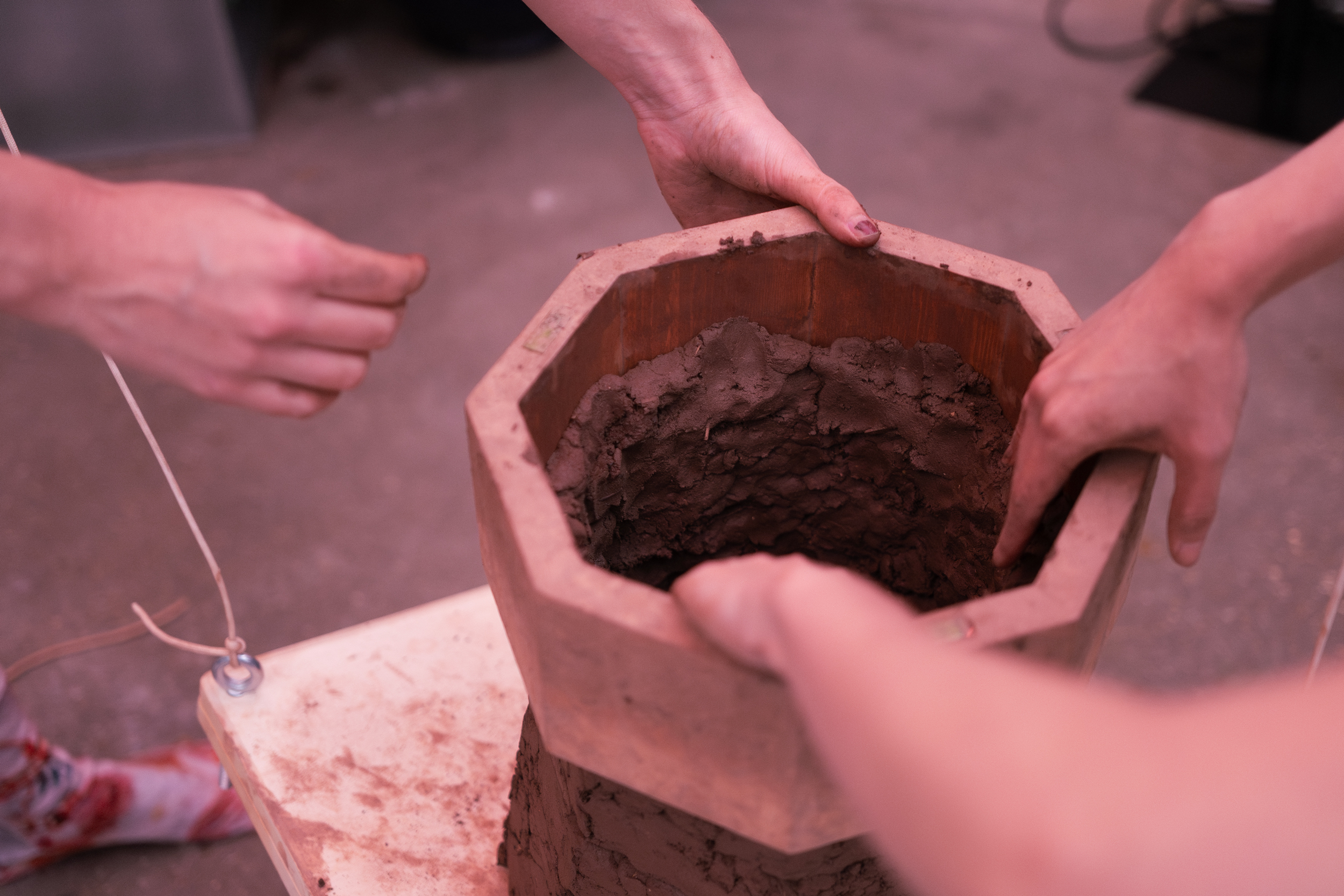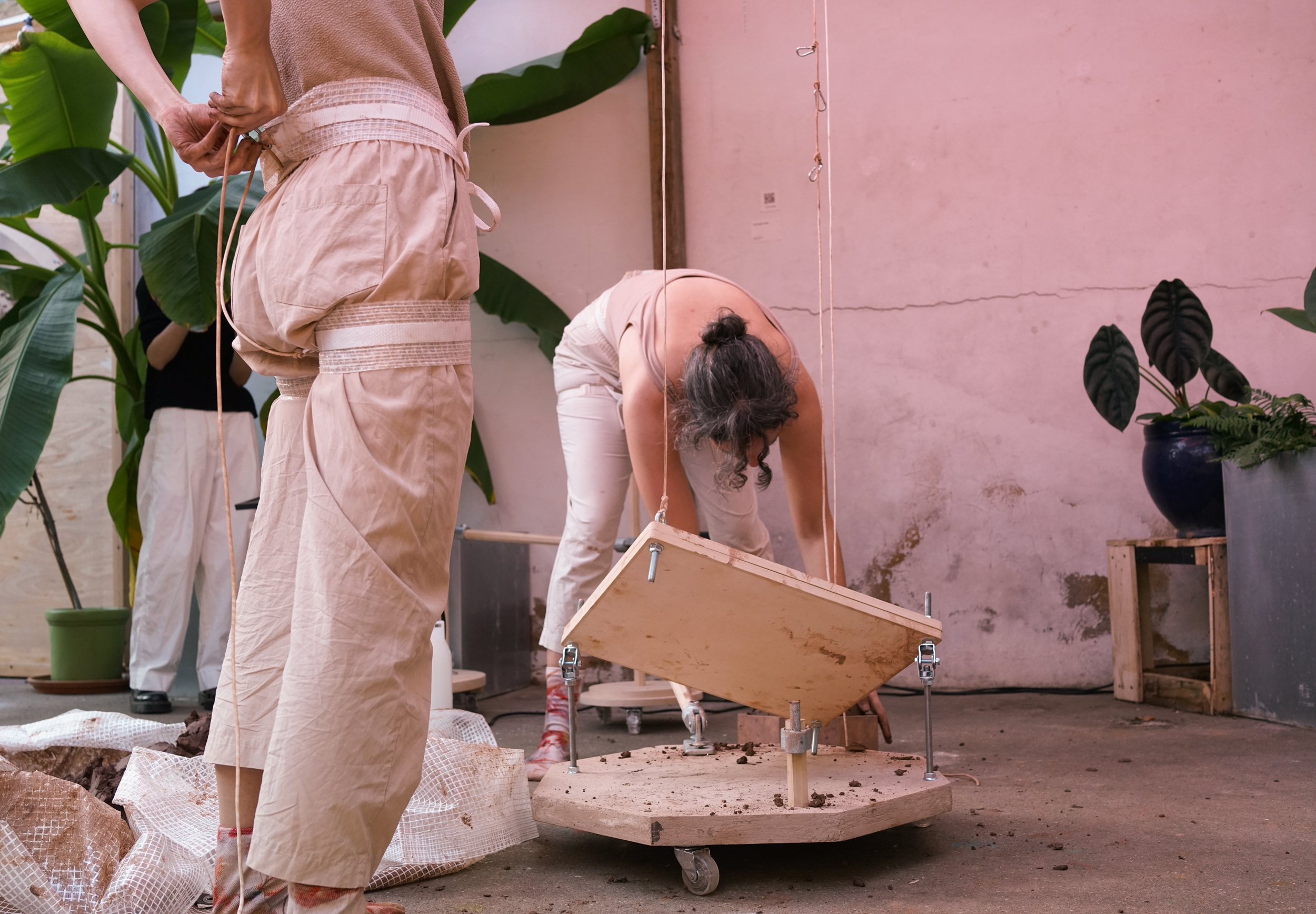 Calling on our many cells to muffle our twisting nerves long enough to learn how to walk level again Level again is a feminist science-fiction experiment weaving together ideas of chronic pain, ecological interconnectedness, and empowering exhaustion of womxn bodies. Performers are connected by cords to a platform on which they work together to build a column out of 75kg of cob – a mix of clay, sand, and hay. The movements of their bodies are communicated to the platform, angling the column as they build. When their construction inevitably collapses, they switch places and restart the game.