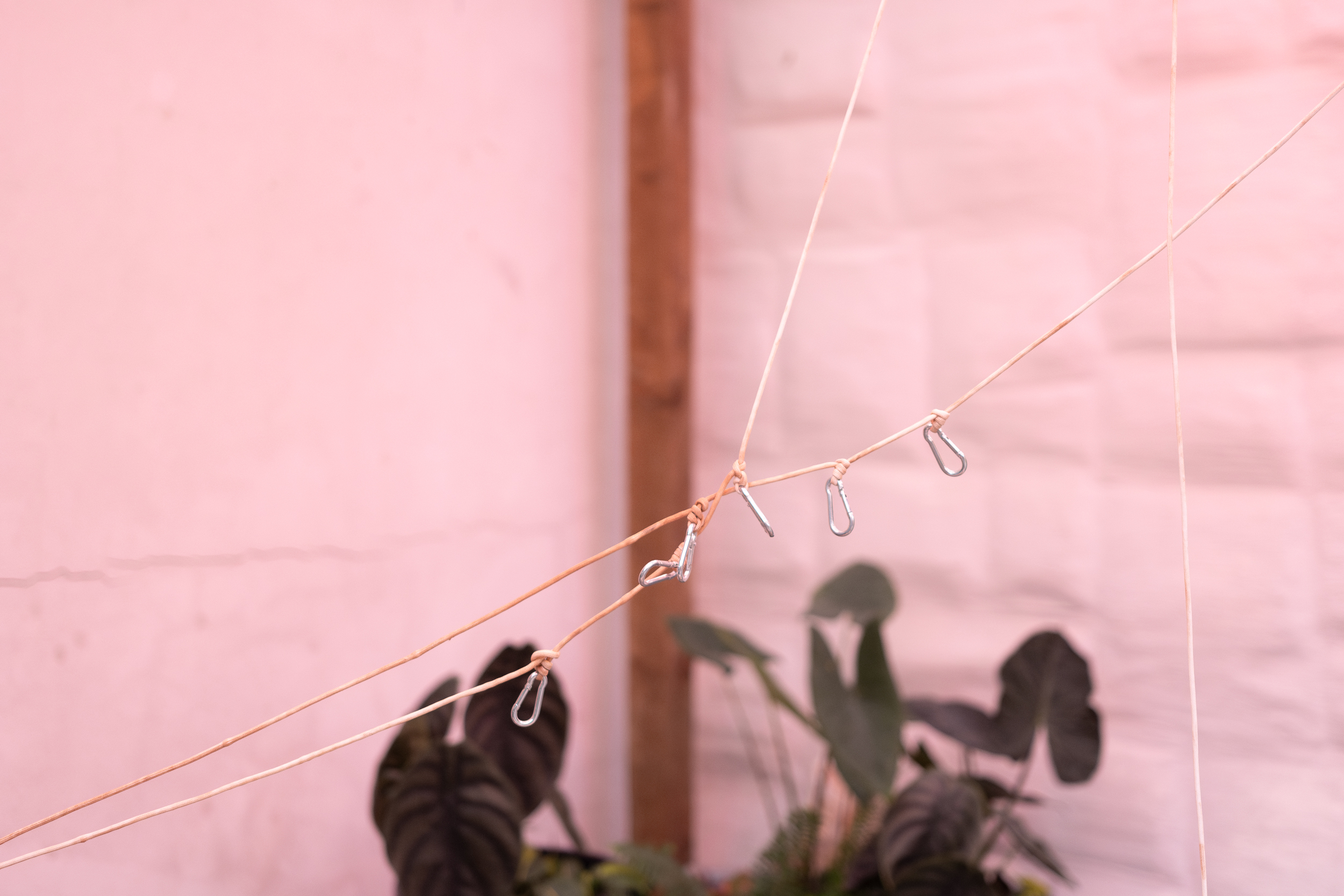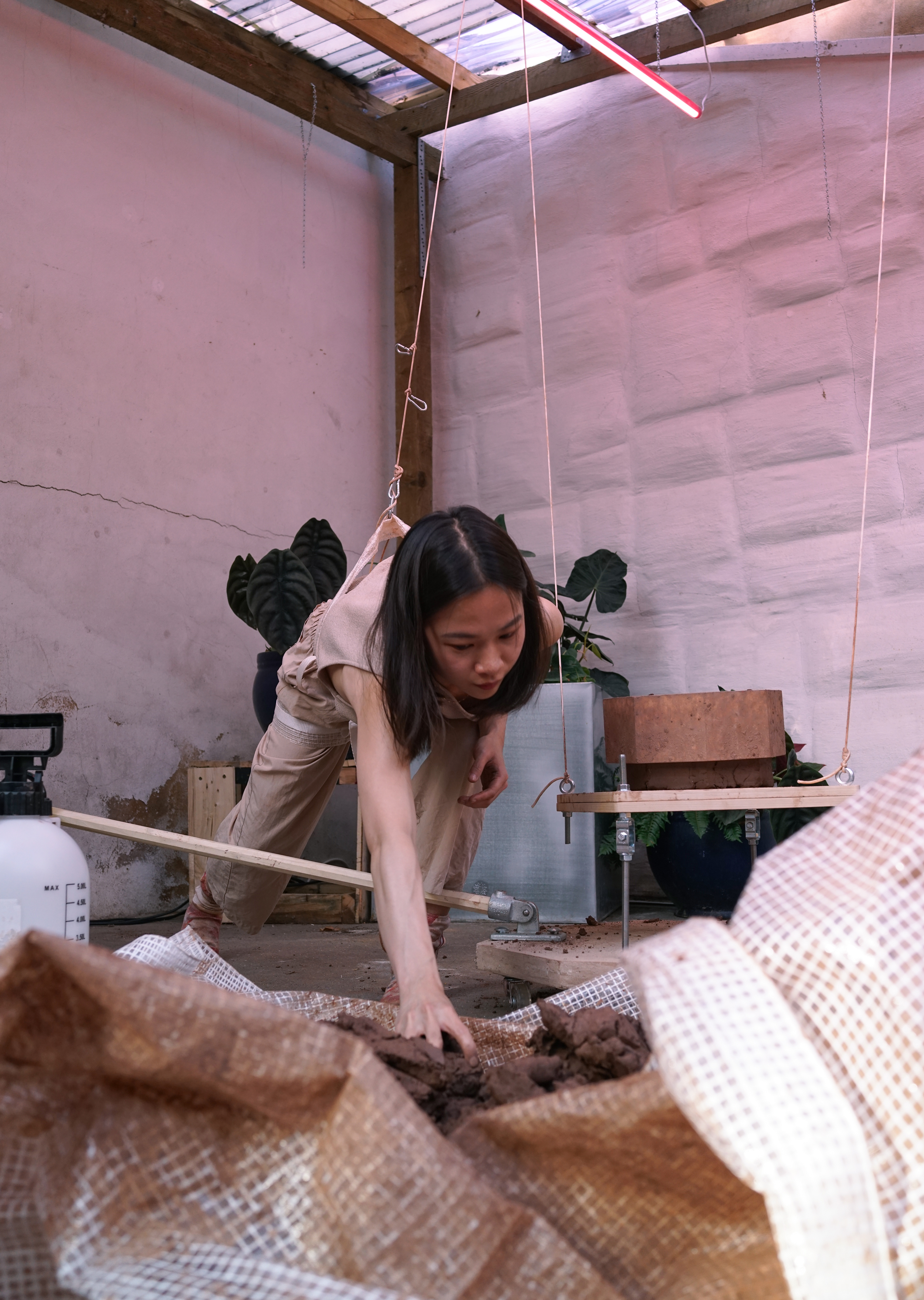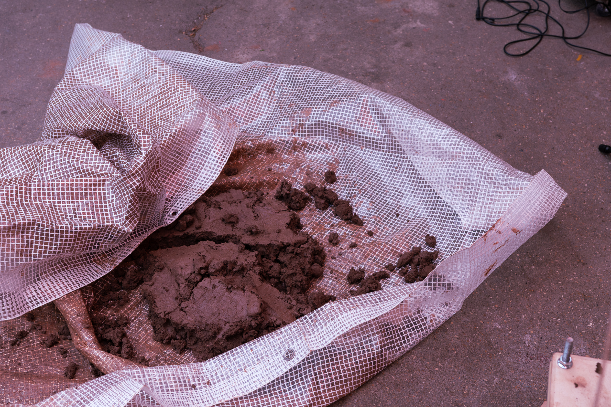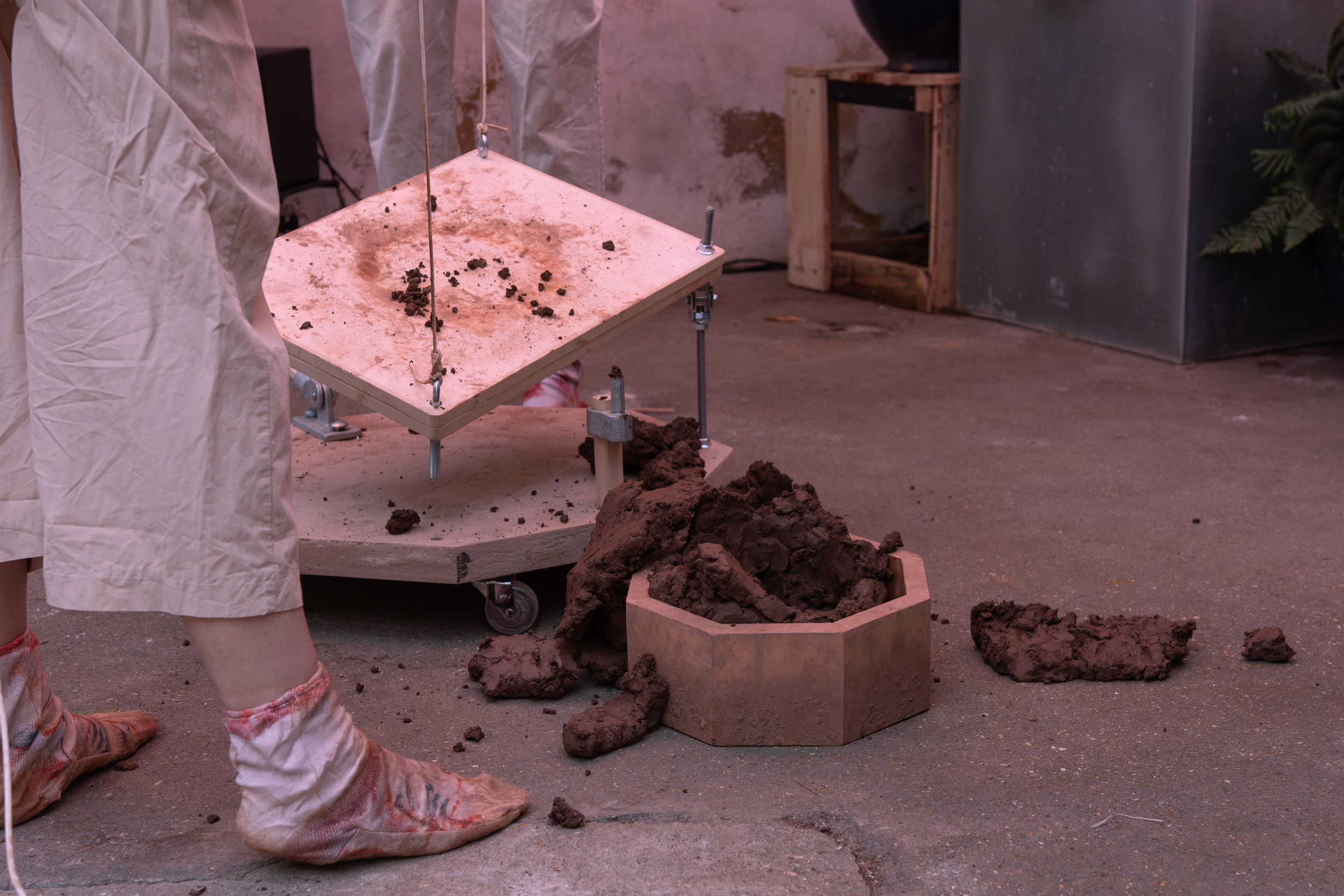 Ambient electronic music (music composition: Anouk Verviers), pink neons, 75kg of cob (mix of clay, sand, and hay), printed socks worn by the performers, harnesses made from recycled tarp, pulleys, carabiners, water sprayer, tarp, scaffolding pieces, recycled poplar and plywood, rods, wheels