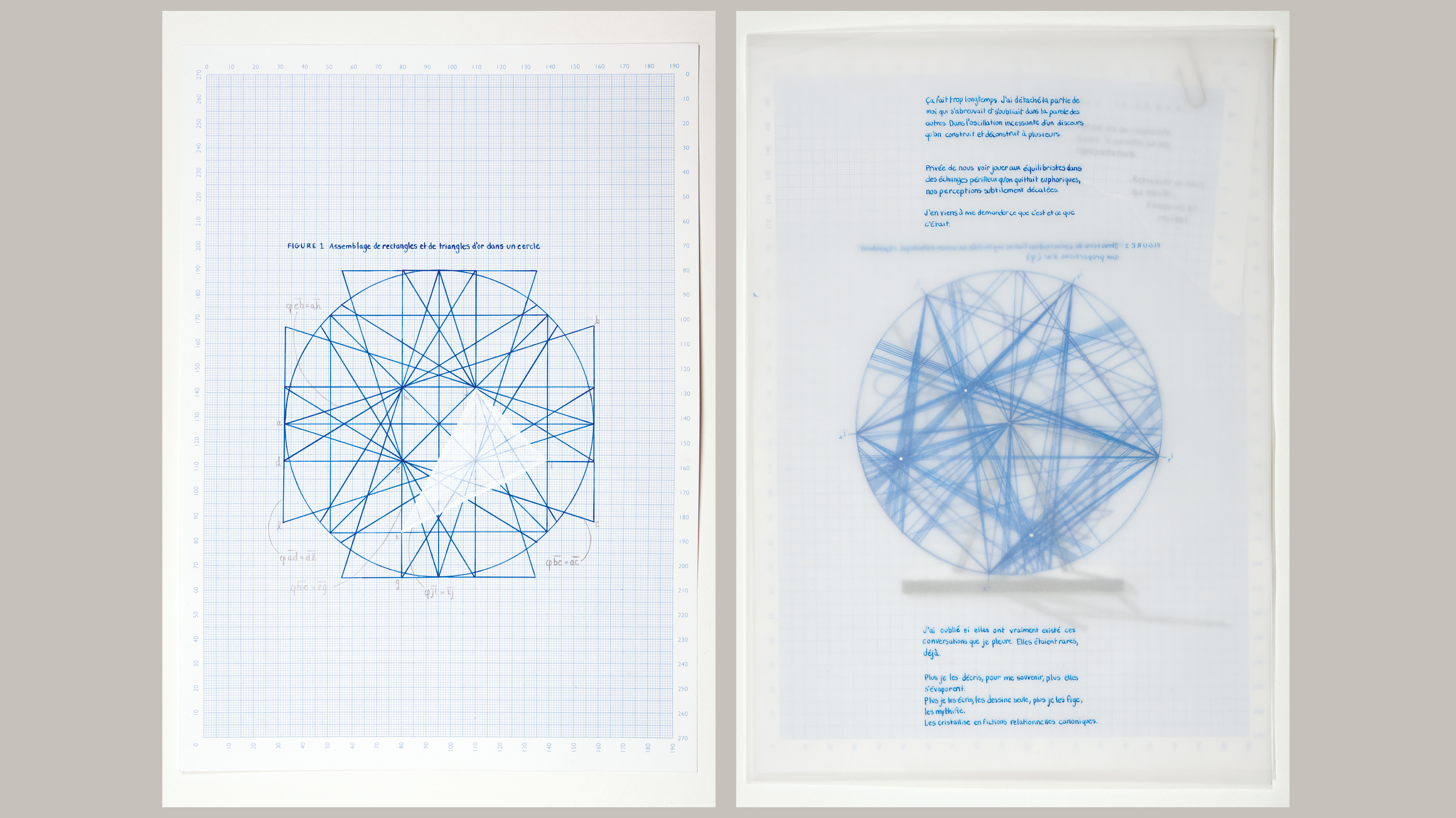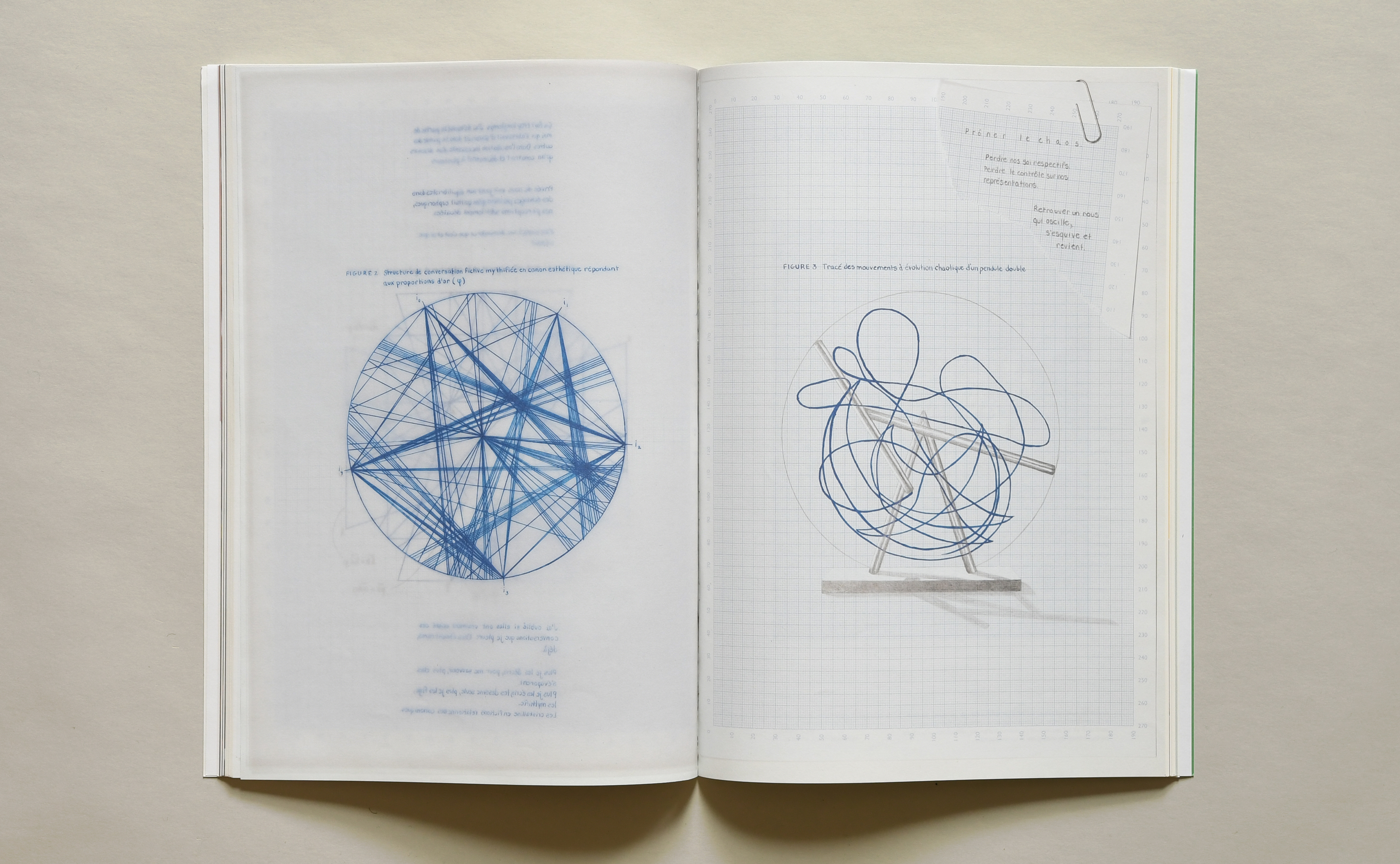 Translated into a visual sequence that plays with the illusion of a translucent paper that juxtaposes two geometric ideals, the golden ratio and the trajectory of a double pendulum, the fictitious conversations generate a visual universe that aspires to a dynamic sharing between its participants. Do consensuses have aesthetic forms? What room is there for chaos when we seek to harmonise human relationships? Prôner le chaos (Advocating for chaos) is the result of a long-term process in which the artist experiments with new structures for living together.