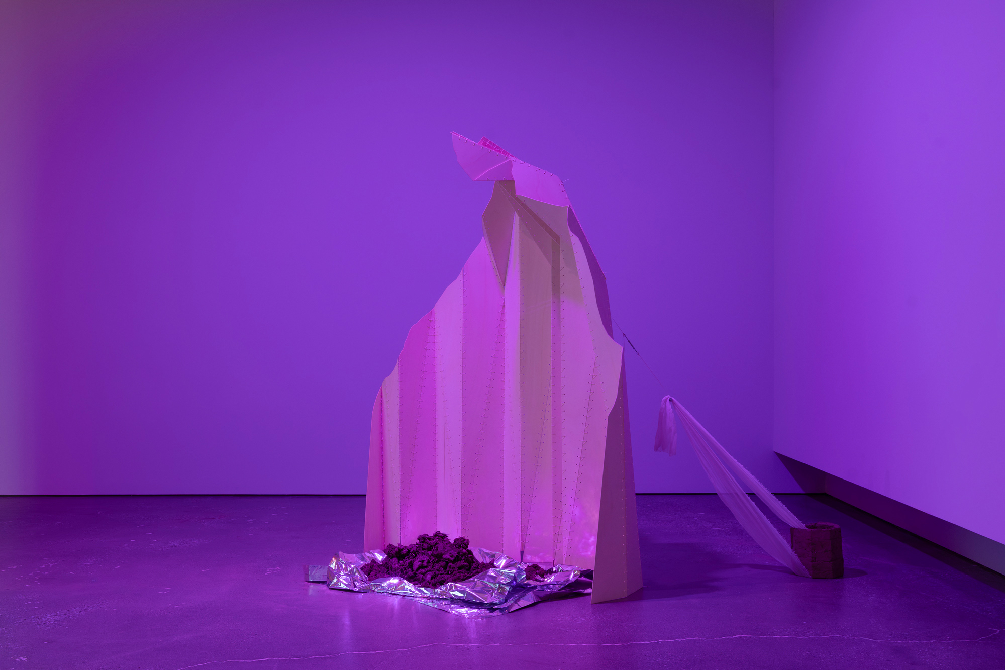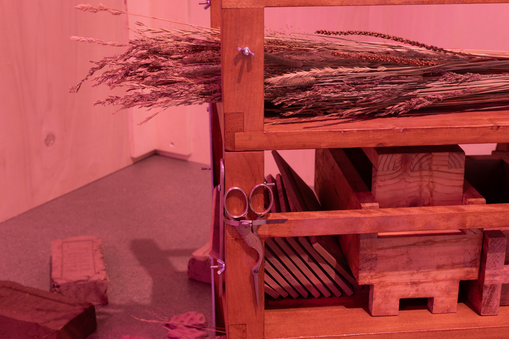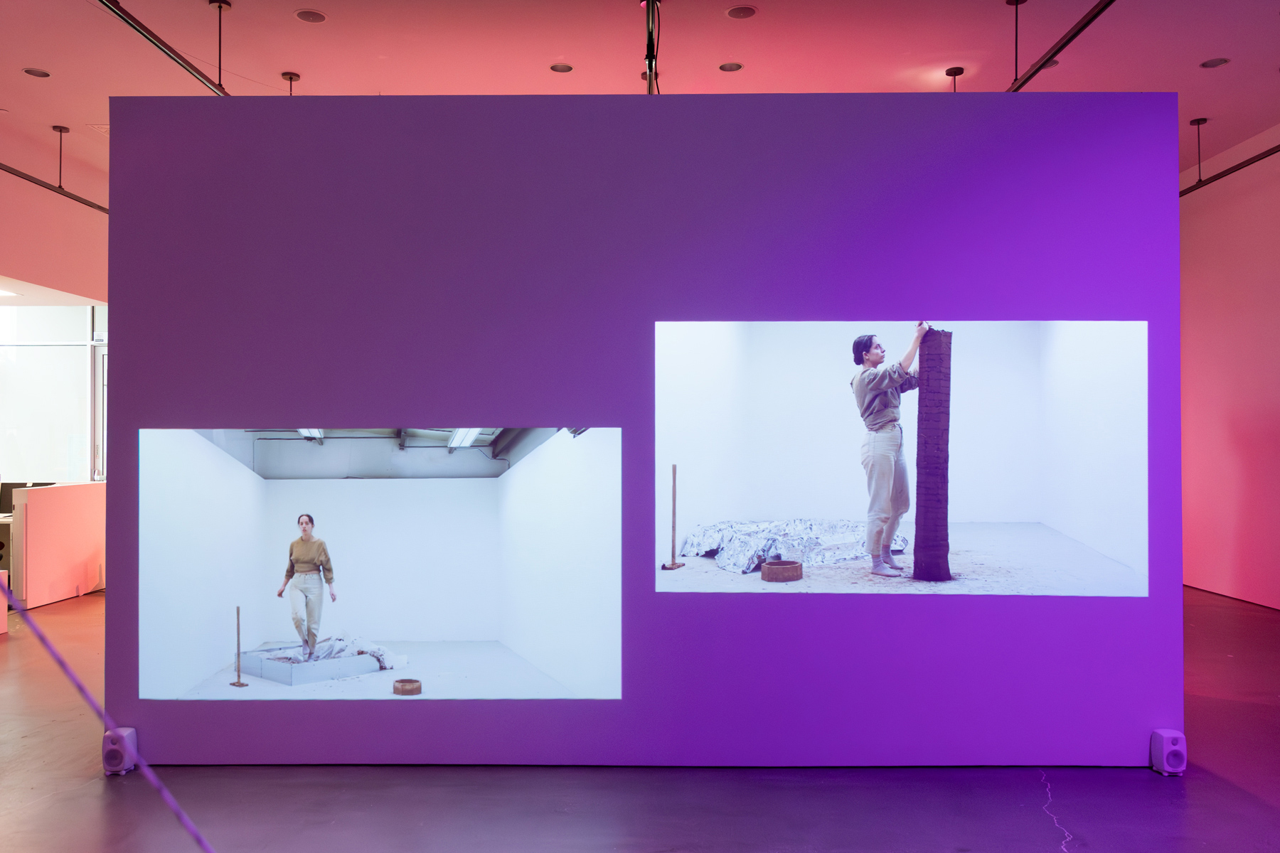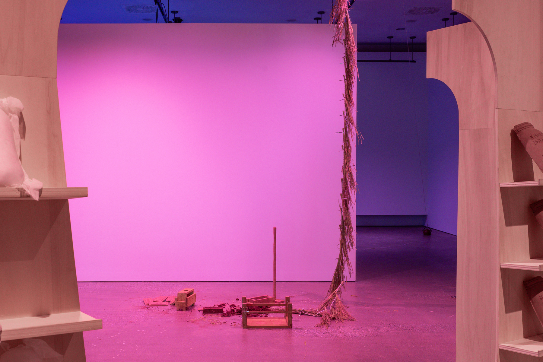The exhibition delves into these stories and the ideas about land, heritage, and dispossession that they evoke. By traversing layers of history, gestures, and voices, Verviers probes the cracks of a divisive economic system to reinvent forms of “living together.” In order to create a dialogue between them, she uses the actions of churning to make mud bricks, adding fragments of thoughts to them. In the gallery, a reconstructed fragment of the Canadian pavilion at the 1886 Colonial and Indian Exhibition in London holds four videos representing different attempts at creating a dialogue between the personal and the political and perhaps rediscovering the meaning of working together.