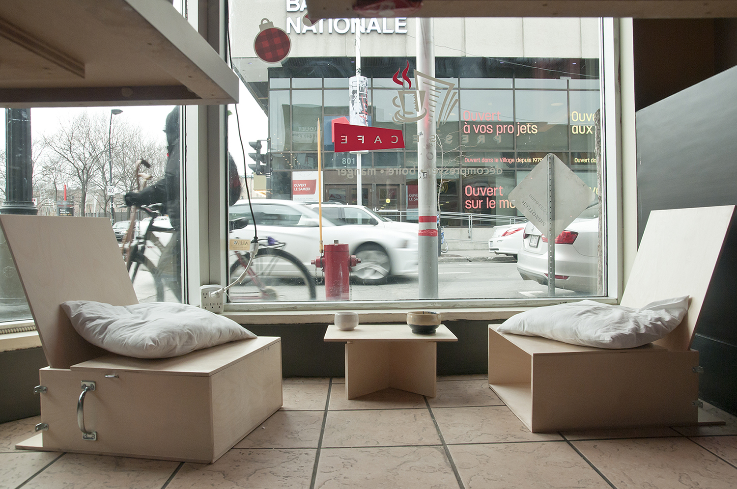 Dealing with notions of spectatorship, responsability and autonomy, the conversations took place in public spaces transformed by the modular furniture.