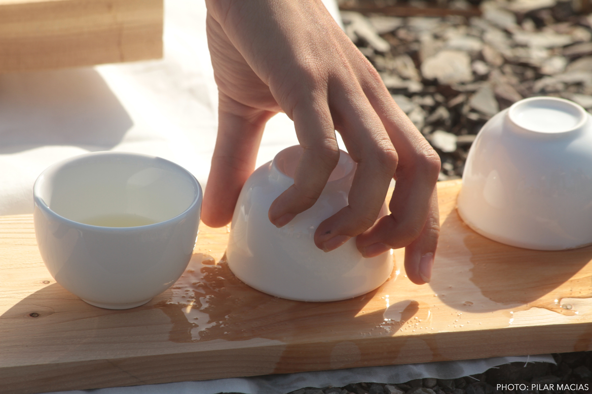 I prepared tea using carefully curated objects and gestures. A traditional wood coals stove was used for heating of the water and rose petals sourced from the landscape were added to the tea leaves. Tea was served in order to complement the experience of the installation.
