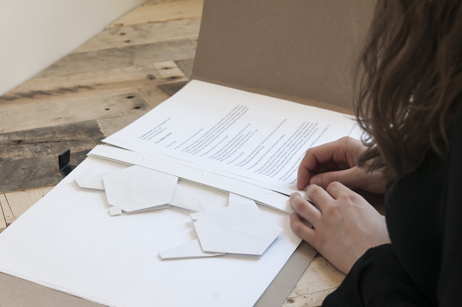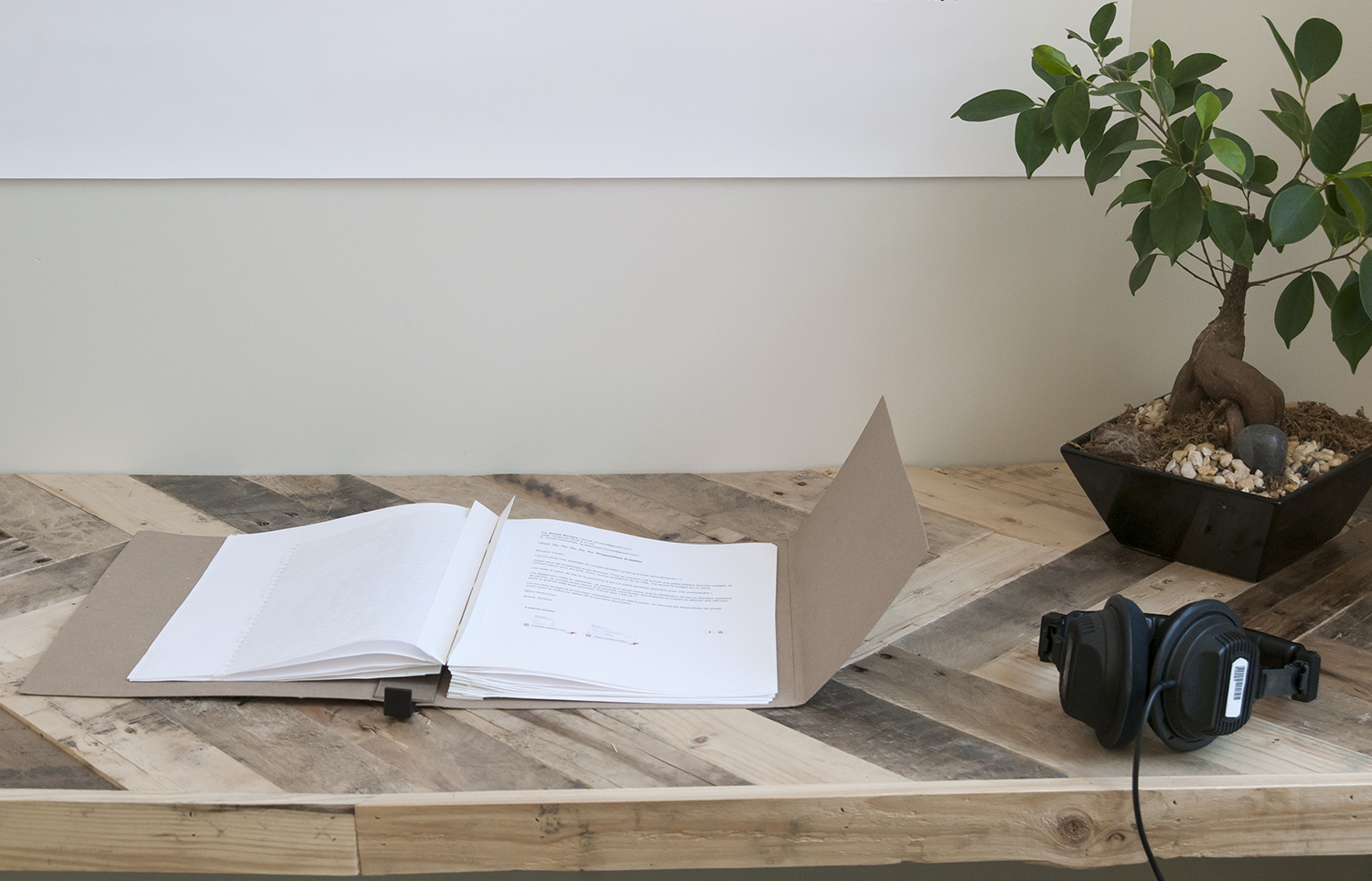 Installation. Written documentation, reflexions, folders and handmade wooden desk.