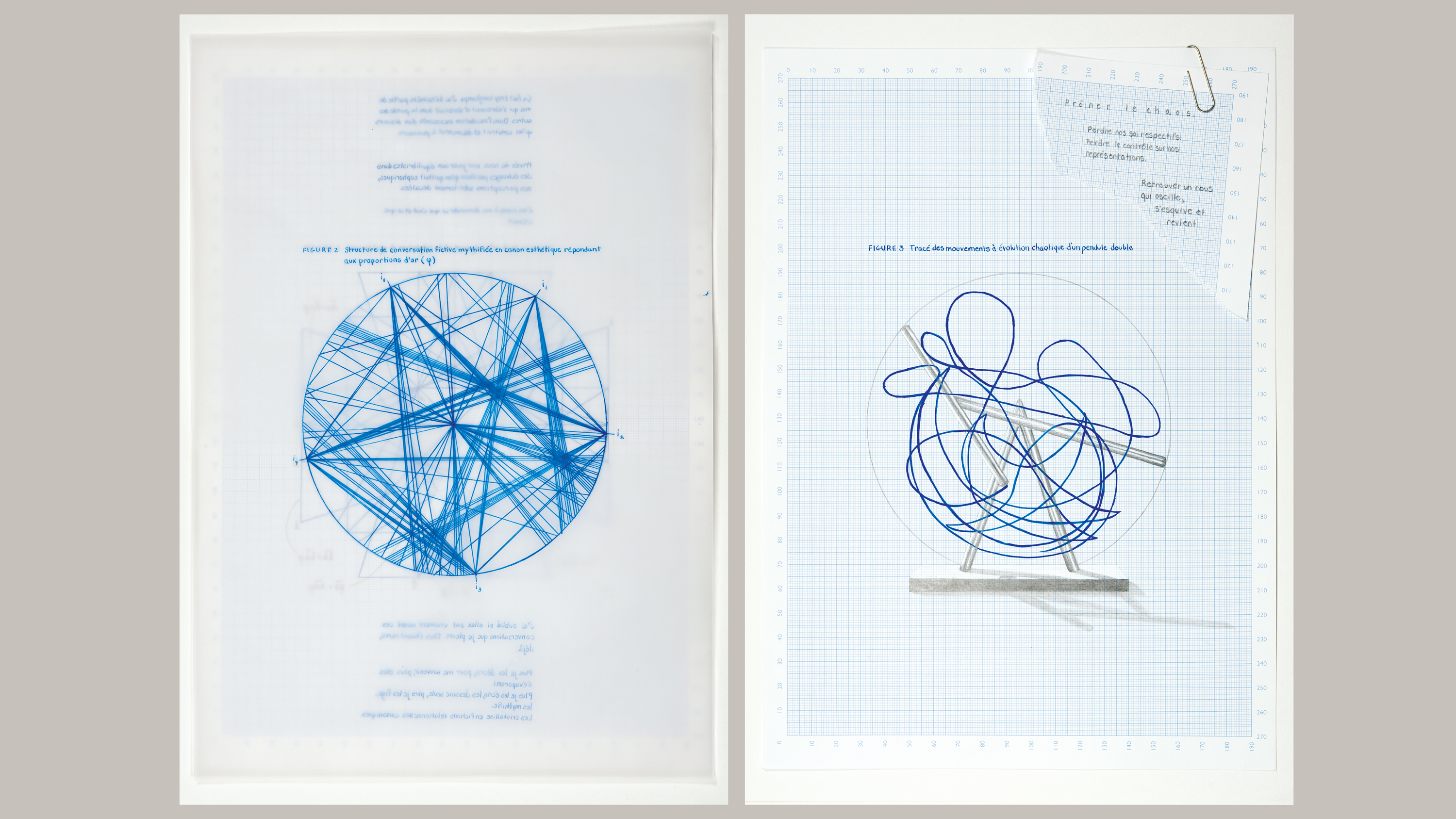 Translated into a visual sequence that plays with the illusion of a translucent paper that juxtaposes two geometric ideals, the golden ratio and the trajectory of a double pendulum, the fictitious conversations generate a visual universe that aspires to a dynamic sharing between its participants. Do consensuses have aesthetic forms? What room is there for chaos when we seek to harmonise human relationships? Prôner le chaos (Advocating for chaos) is the result of a long-term process in which the artist experiments with new structures for living together.